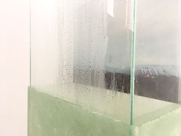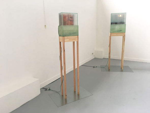 Dimensions variables. 49 x 75 x 154 cm - 60 x 90 x 163 cm et 101 x 78 x 154 cm - Impression photographique sur papier polyester, résine polyester, verre, chauffage, eau, bois, acier galvanisé - 2018